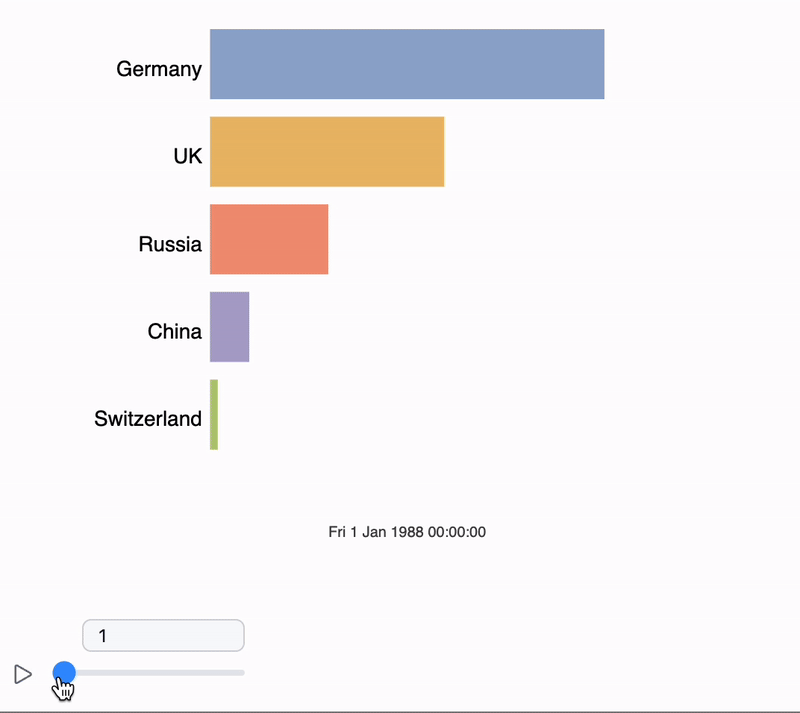 You've likely seen videos featuring animated bar charts with a timeline, where the bars dynamically shift and overtake each other. Here is a snippet for that