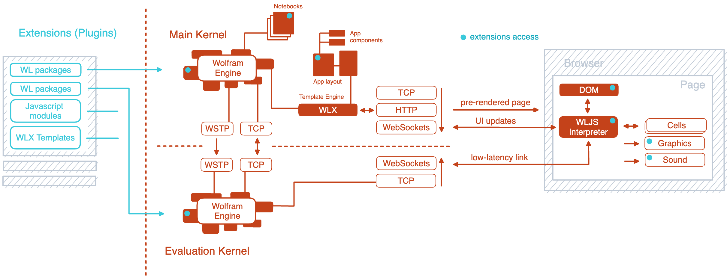We use as much SSR (Server-Side Rendering) as possible via a basic HTTP channel. The main kernel establishes a WebSocket connection to provide interactivity and avoid long polling. Each evaluation kernel (limited to one by the freeware license) has its own dedicated WebSocket connection to the page. This approach ensures optimal performance for dynamic evaluations involving real-time video streaming or updating polygons in a 3D plot. We use a binary protocol instead of a text-based one to update data within expressions.