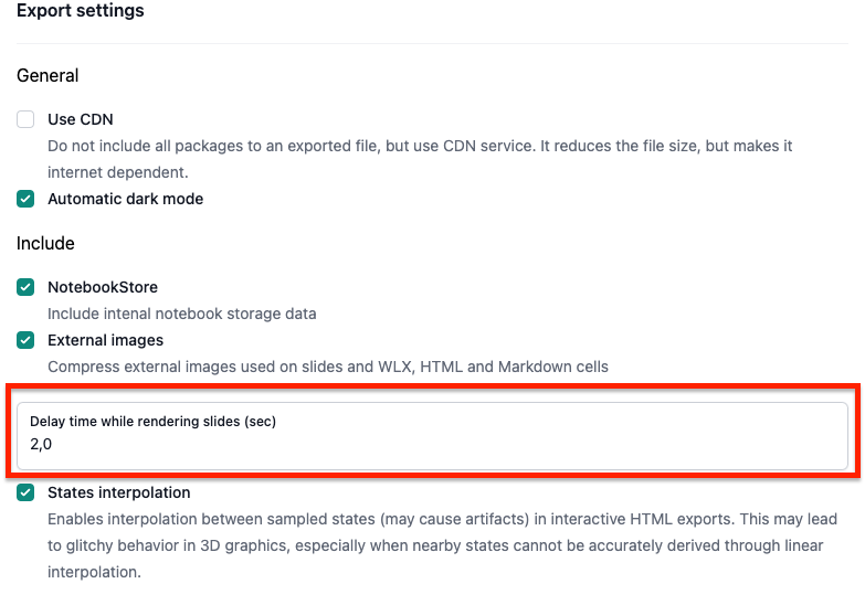 This parameters introduces the delay before the slide is rendered to PDF to settle down all dynamics and transitions.