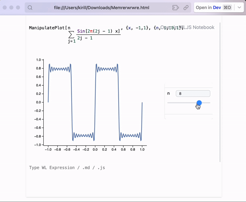 AnimatePlot[(*TB[*)Sum[(*|*)(*FB[*)((Sin[2π(2j - 1) x])(*,*)/(*,*)(2j - 1))(*]FB*)(*|*), {(*|*)j(*|*),(*|*)1.0(*|*),(*|*)n(*|*)}](*|*)(*1:eJxTTMoPSmNiYGAoZgMSwaW5TvkVmYwgPguQCCkqTQUAeAcHBQ==*)(*]TB*), {x, -1,1}, {n, 1,30, 1}] (*VB[*)(FrontEndRef["a813f88d-91cb-4111-9ffe-faa53209ac3f"])(*,*)(*"1:eJxTTMoPSmNkYGAoZgESHvk5KRCeEJBwK8rPK3HNS3GtSE0uLUlMykkNVgEKJ1oYGqdZWKToWhomJ+maGBoa6lqmpaXqpiUmmhobGVgmJhunAQCHNBYC"*)(*]VB*) Dynamic HTML export