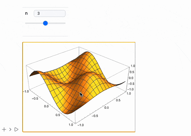 Manipulate[Plot3D[Sin[n x] Cos[n y], {x,-1,1}, {y,-1,1}], {n, 1, 5, 1}] // MMAView